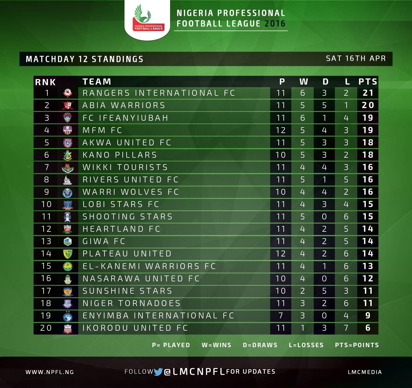 The Nigeria premier league football league NPFL standings as at Saturday 16th of April 2016